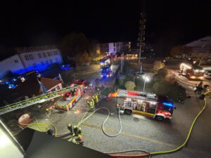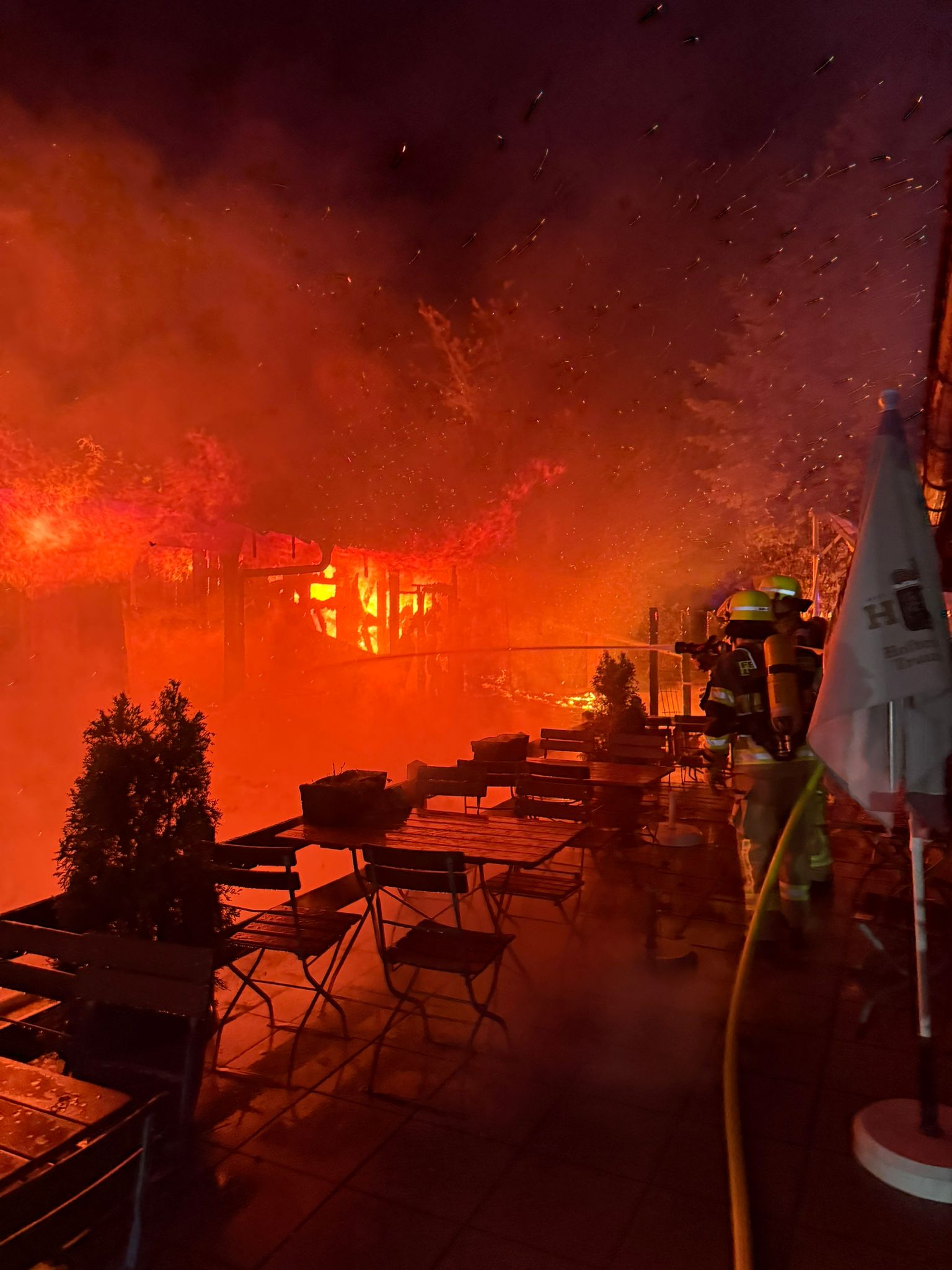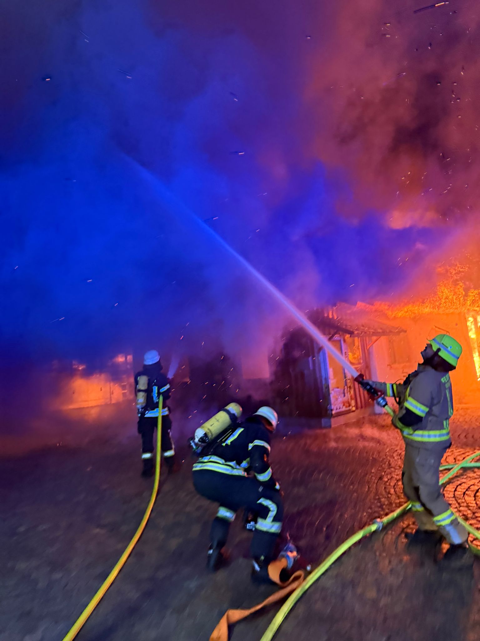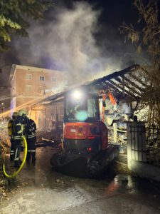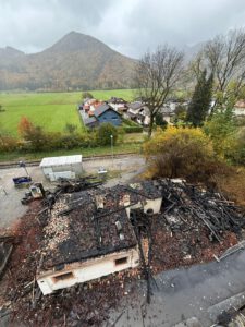 Das Gebäude des Bergbauernladens wurde leider Opfer der Flammen. Mit etlichen Trupps und zwei Drehleitern wurde das Gebäude abgelöscht. Aufgrund der massiven Beschädigung mussten auch die Glutnester mit einem Bagger freigelegt werden.
