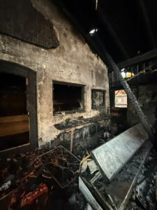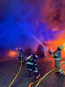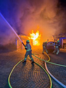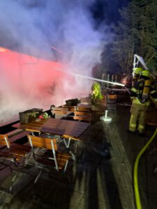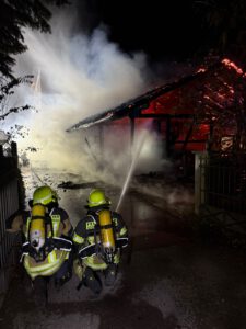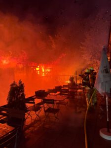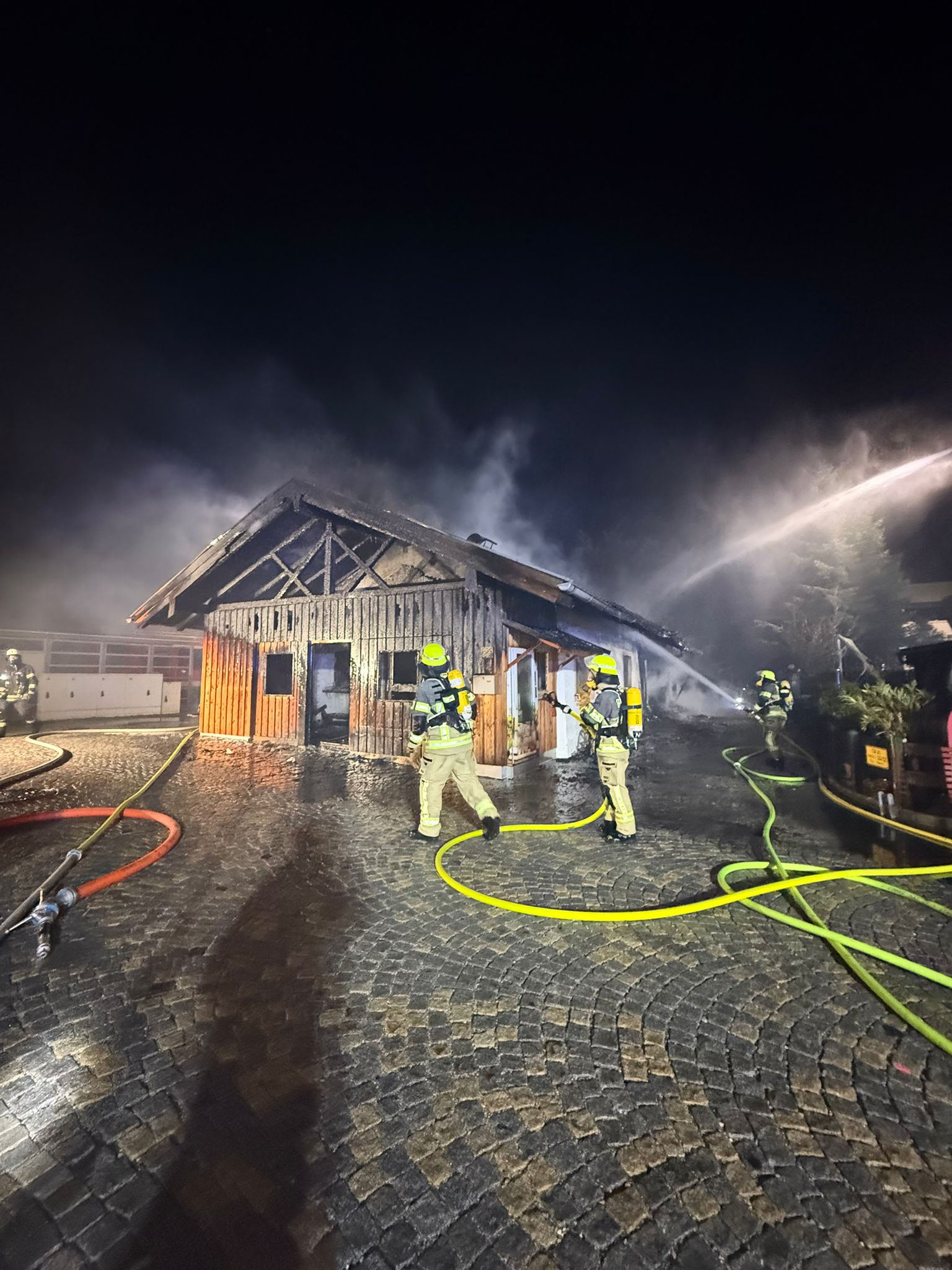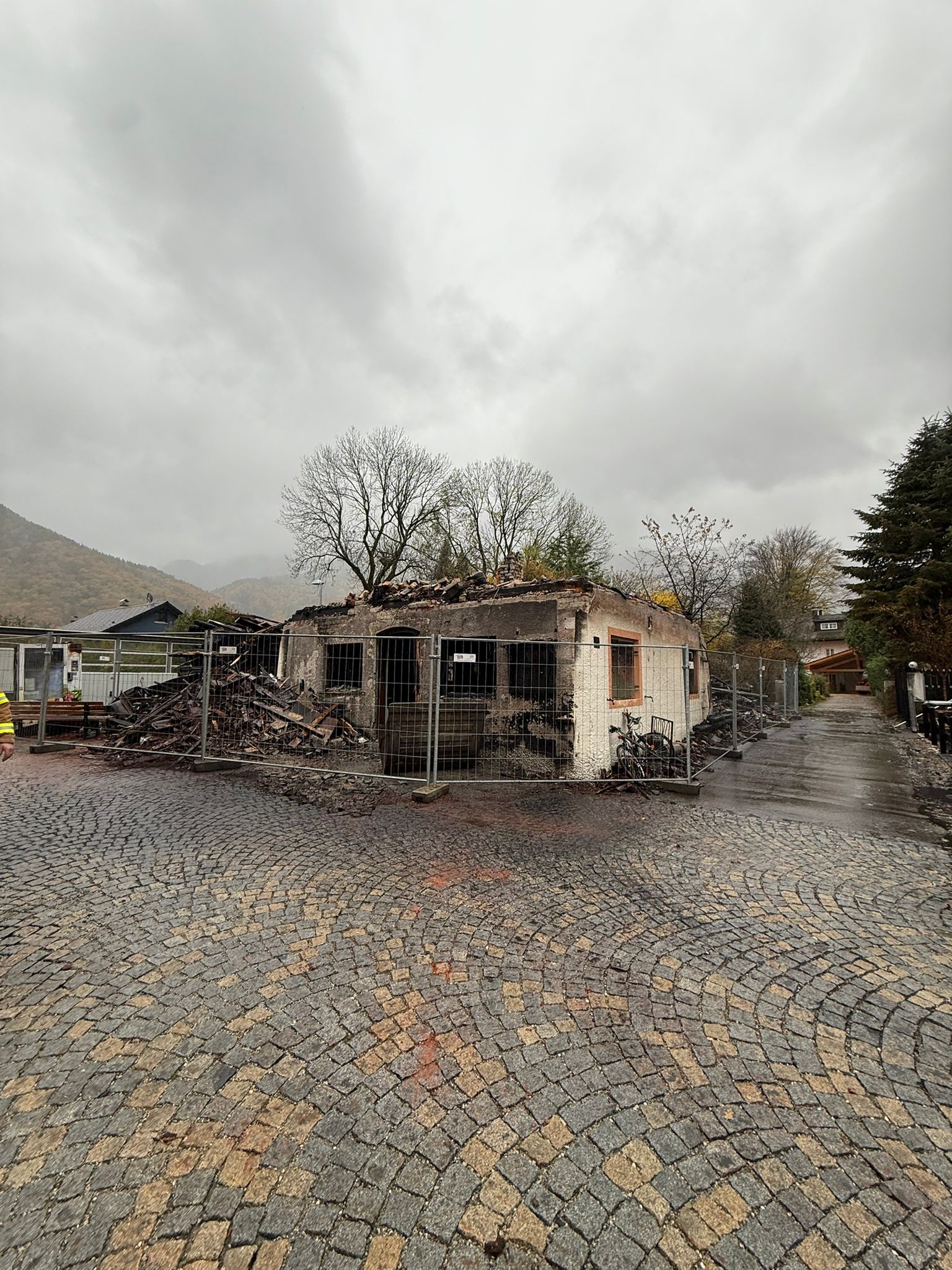 Nach dem ersten Mülltonnenbrand gegen 2:30 Uhr, wurden wir um 4:05 zum Brand des Bergbauernladens alarmiert. 🚒